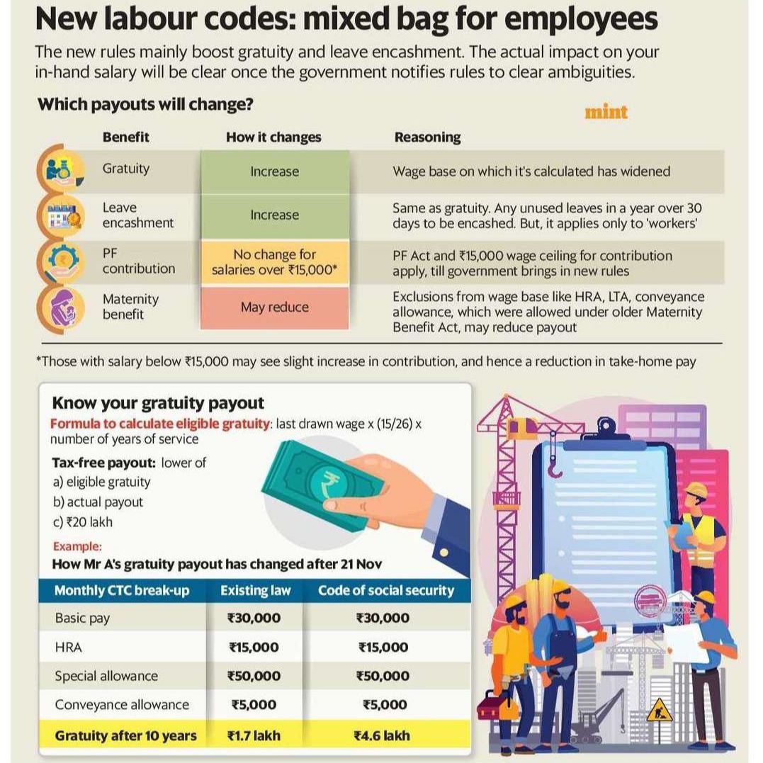 - Gig & Platform Workers: Defined for the first time. Aggregators to contribute 1–2% of turnover for social security.
