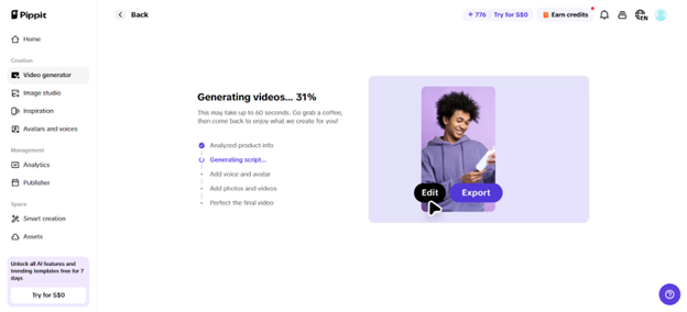 - After clicking “Generate”, the artificial intelligence video generator in Pippit creates the video automatically.
