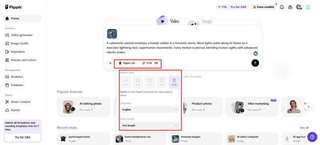 5. Choose “Pippit Lite” mode, then select the video length, language, and aspect ratio.